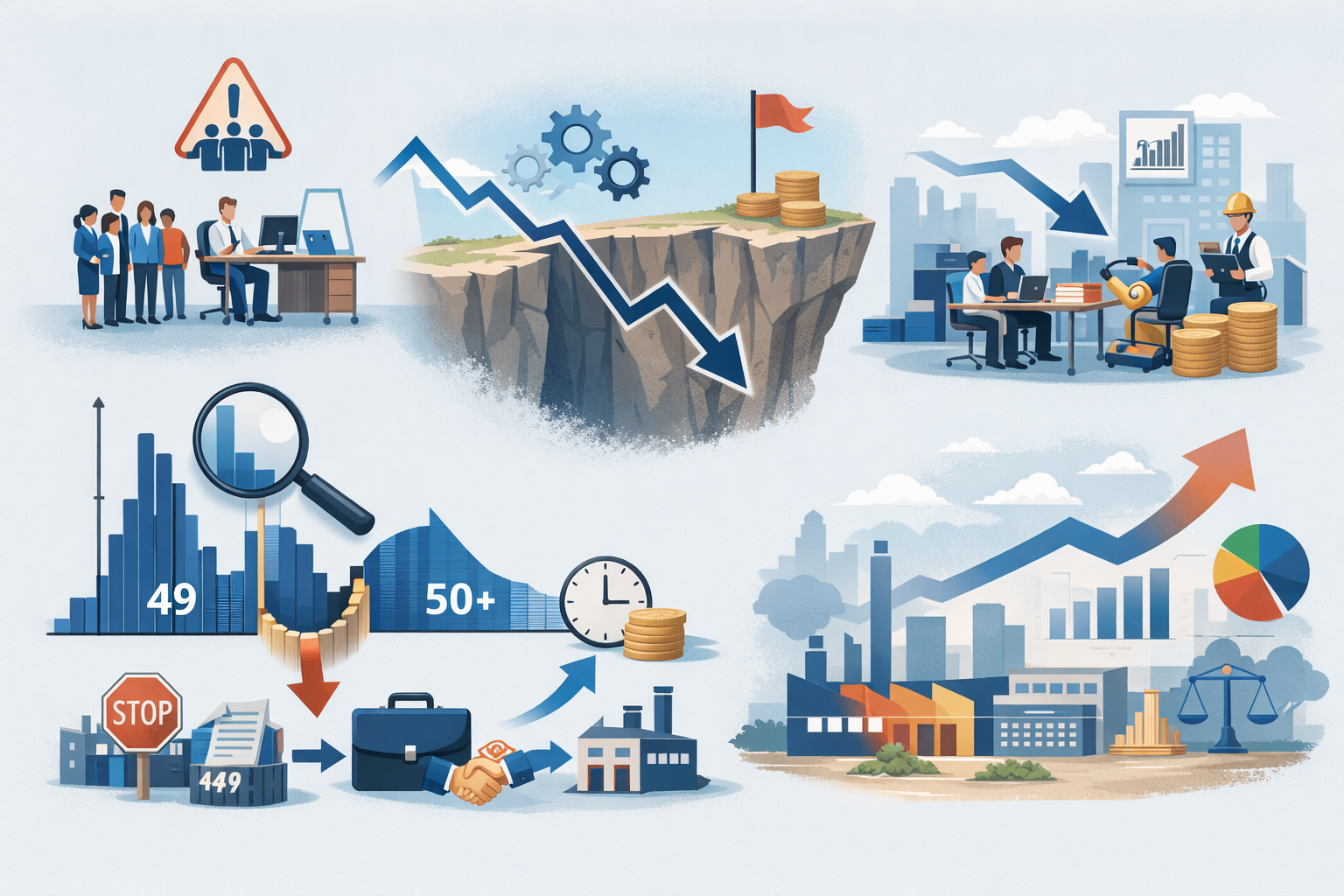 “50명”처럼 특정 규모를 넘는 순간 의무·비용이 점프하면, 기업은 최적 성장 대신 49명 근처에서 멈추거나 우회 전략을 택하고, 그 결과 경제 전체는 자원배분 왜곡(misallocation)과 총산출 감소를 겪는다.