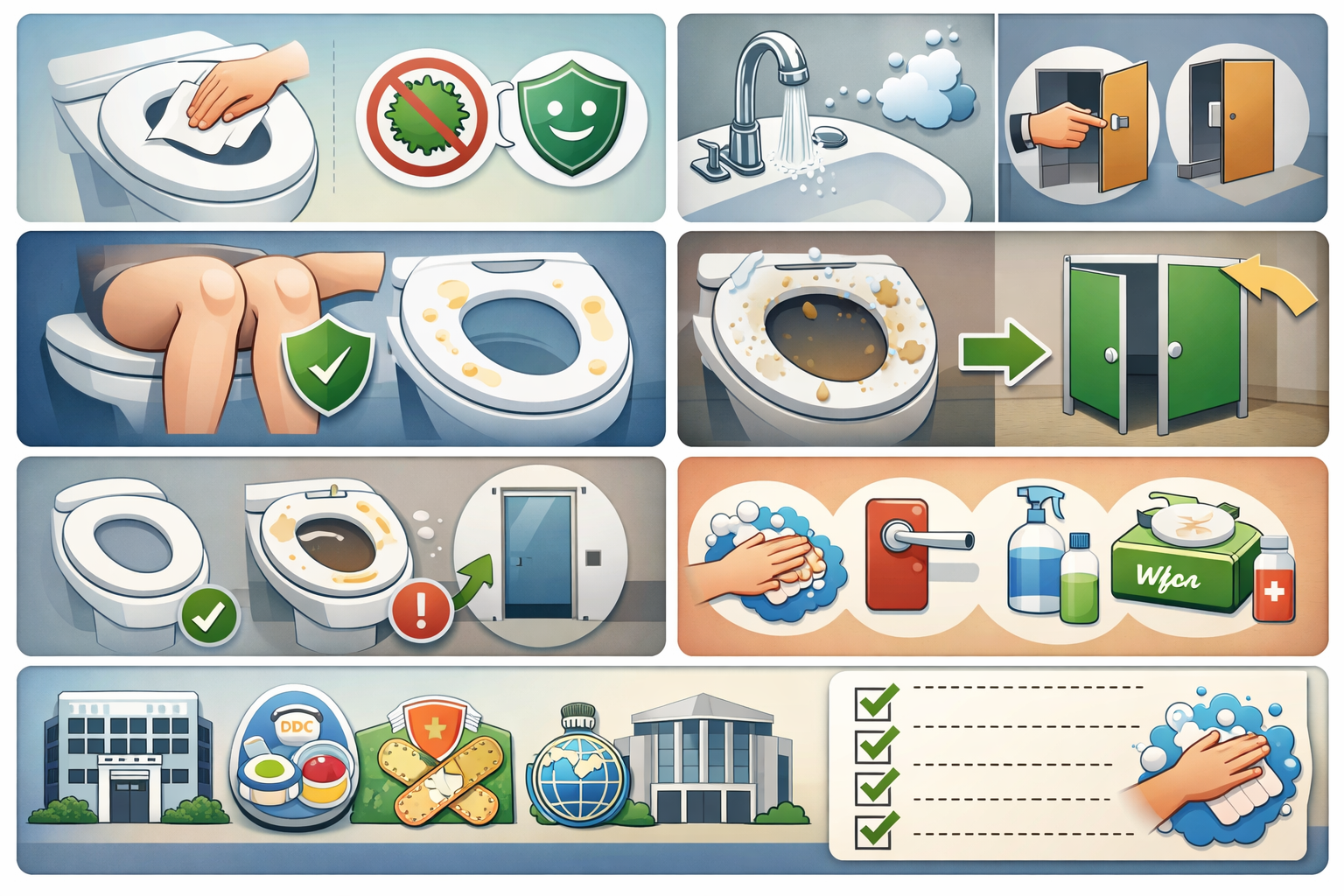 변기 시트보다 손이 자주 닿는 표면이 실제 전파 경로가 되기 쉽습니다. 가능한 한 손 접촉을 줄이고, 나올 때 휴지/종이타월로 문손잡이를 잡는 습관이 도움이 됩니다.