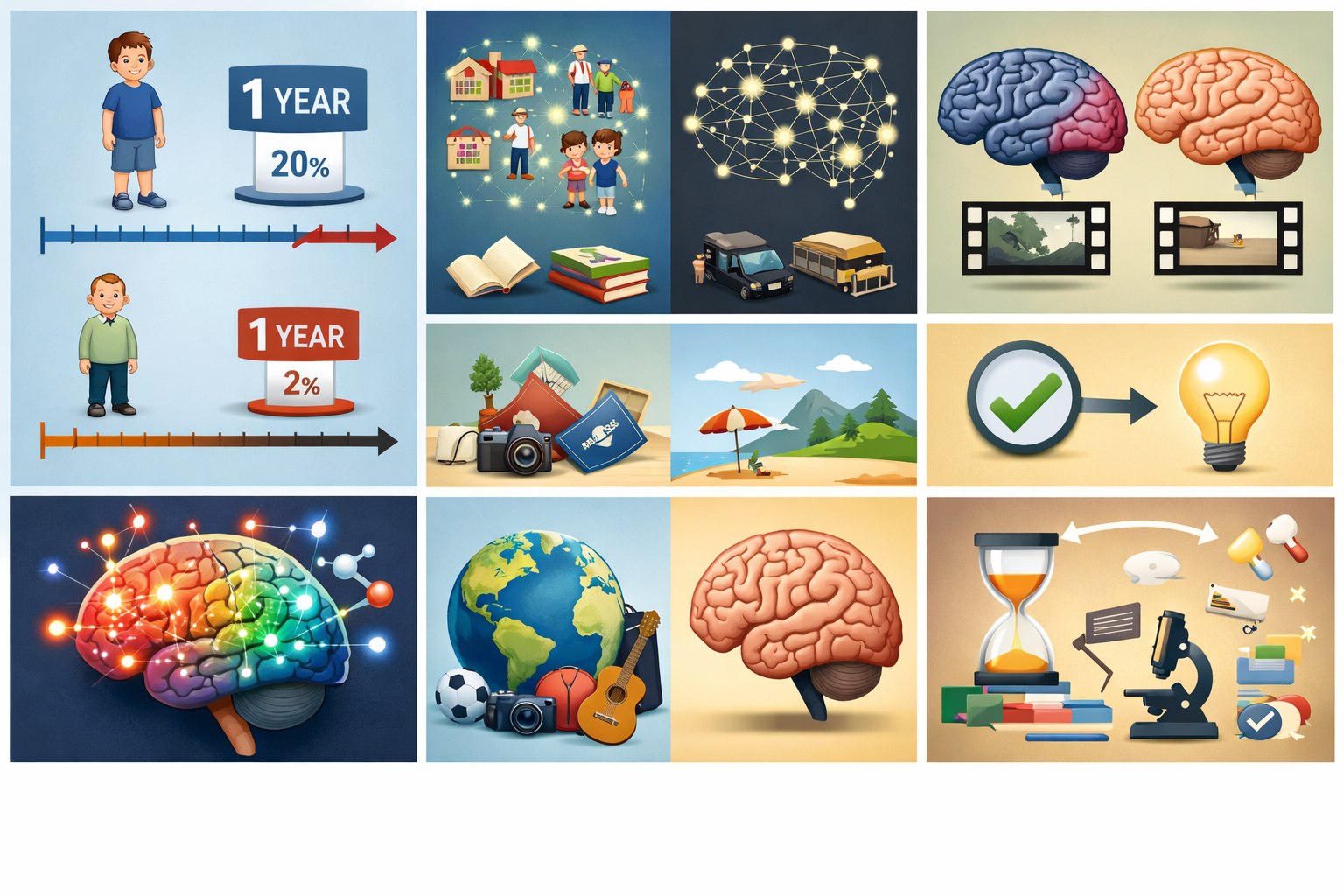 즉, 나이가 들수록 1년이 내 삶에서 차지하는 “비율”이 작아져서 뇌가 상대적으로 더 짧게 받아들이기 쉽습니다. 쉽게 비유하면, 작은 컵에 물 한 컵을 붓는 것(어릴 때)과 큰 통에 물 한 컵을 붓는 것(성인)을 비교하면, 같은 양이라도 “차오르는 느낌”이 다르죠. 시간도 비슷한 원리로 체감이 달라집니다.