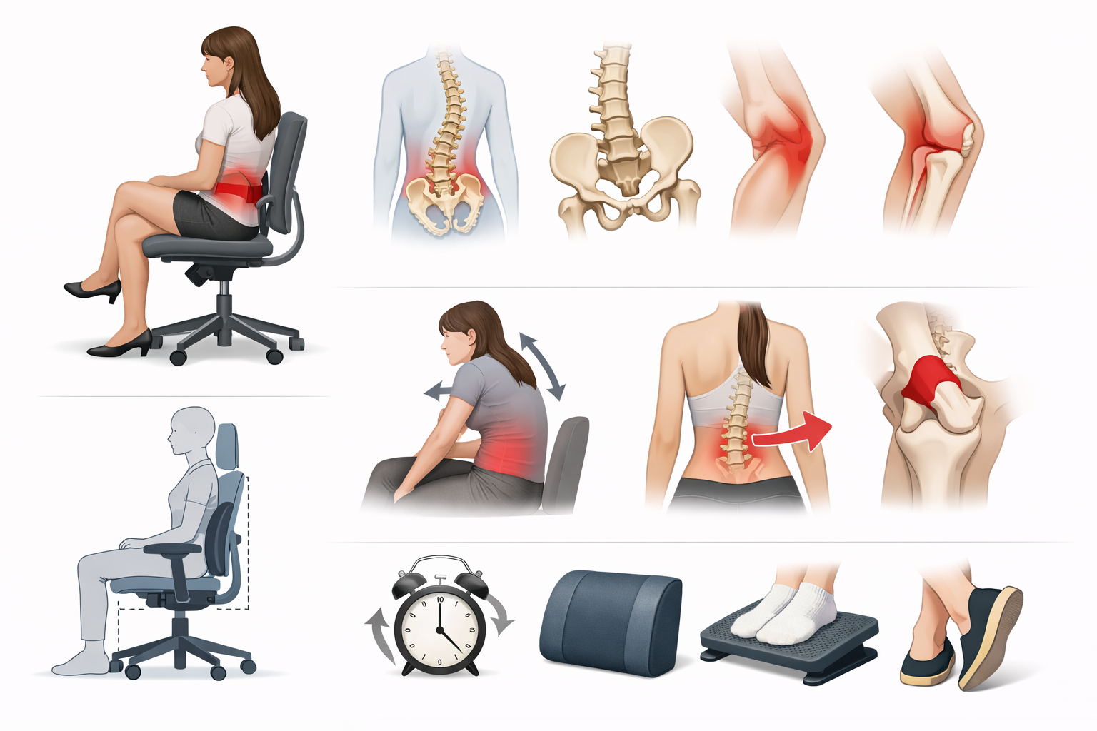 다리 꼬기는 의자에 깊숙이 앉기보다, 엉덩이가 앞으로 밀리며 허리 곡선(요추 전만)이 무너지는 형태로 이어지기 쉽습니다. 이 상태가 길어지면 요통, 뻐근함이 증가할 수 있습니다.