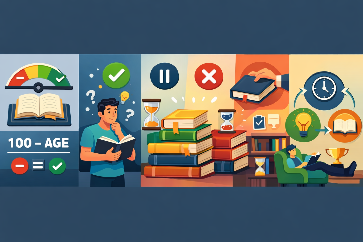 독서 포기 결정 공식은 단순하지만 강력합니다. [100 - 나이] 페이지라는 컷오프는 독서를 ‘의무’가 아니라 ‘전략’으로 바꾸고, 좋은 책에 더 많은 시간을 쓰게 만들어 줍니다. 핵심은 “덮는 능력”이 아니라, 내게 맞는 책을 더 빠르게 찾는 능력입니다. 계속 / 보류 / 중단을 명확히 나누고, 독서를 가볍고 오래가는 습관으로 만들어 보세요.