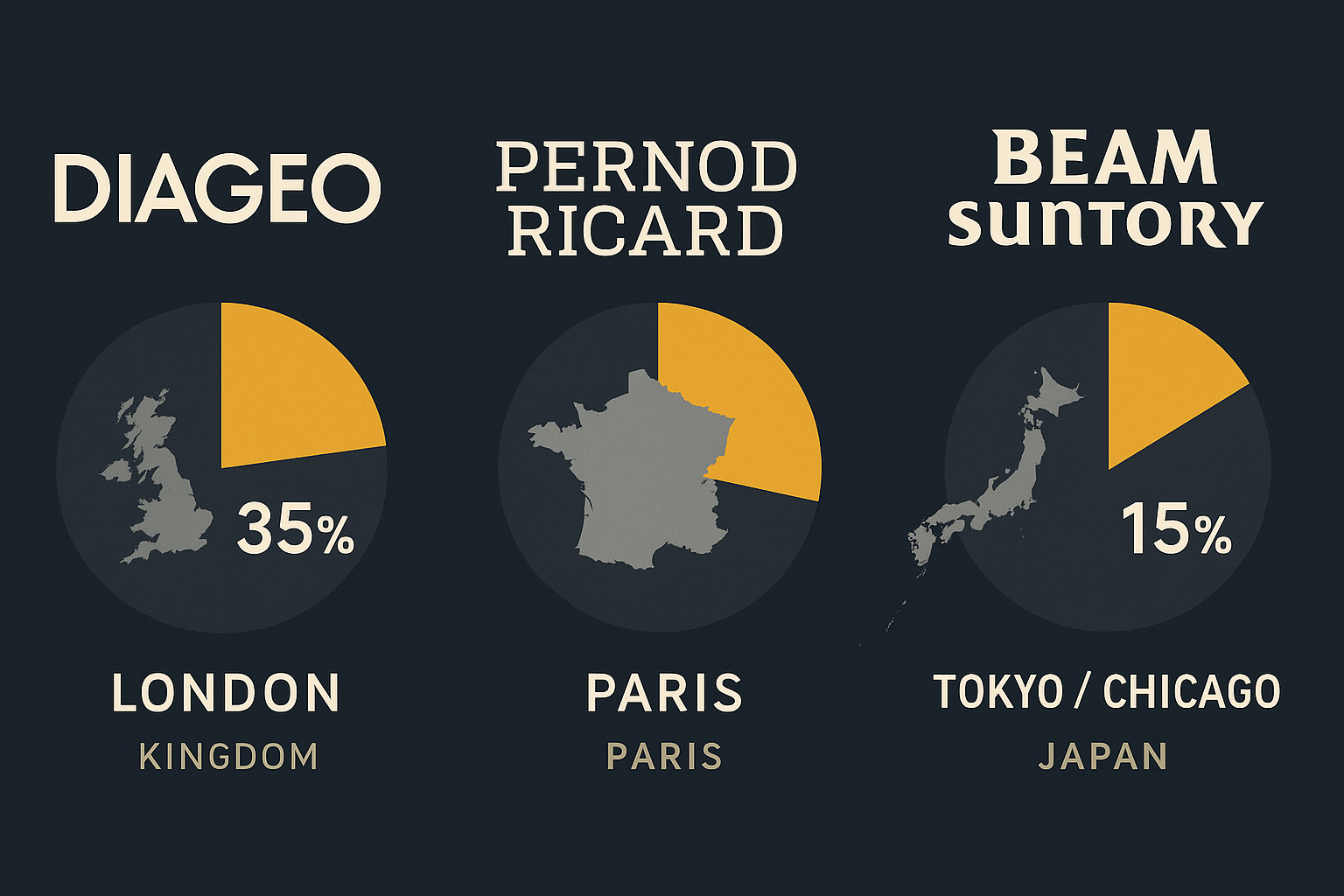 세계 위스키 시장은 수백 개 브랜드와 수십 개 기업이 경쟁하고 있지만, 점유율과 영향력 측면에서 디아지오(Diageo), 페르노 리카르드(Pernod Ricard), 빔산토리홀딩스(Beam Suntory)가 ‘빅3’를 형성하고 있습니다. 이 세 그룹은 스카치, 아이리시, 버번, 일본 위스키까지 아우르는 글로벌 포트폴리오를 보유하며, 프리미엄 시장과 대중 시장을 동시에 공략합니다.