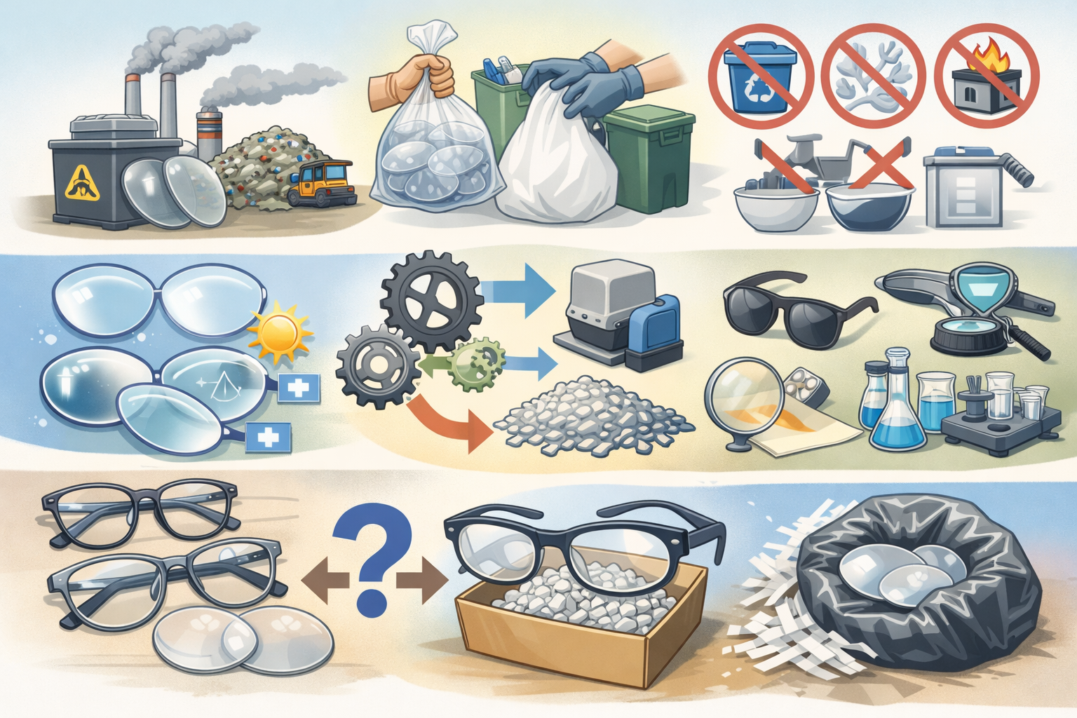 현재 기준(일반 소비자 관점)에서는 안경 렌즈를 안정적으로 재활용할 수 있는 전용 시스템이 거의 없습니다. 이유는 “복합 소재 + 소량 다품종”이라 선별 비용이 너무 높기 때문입니다.