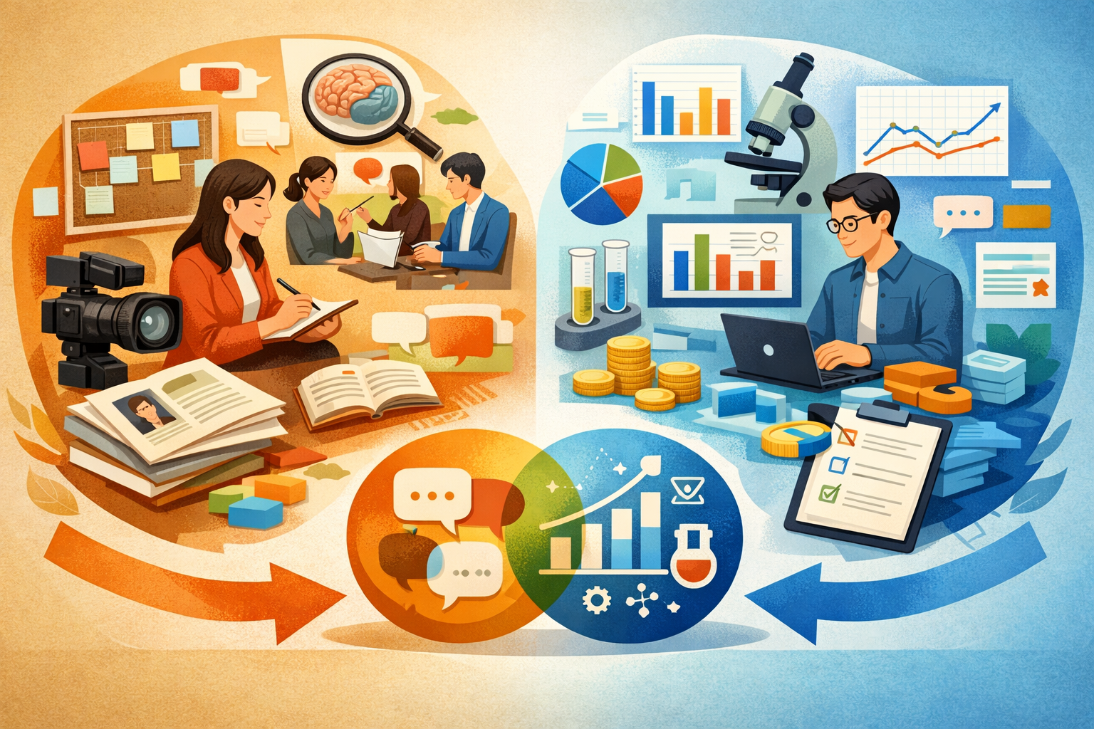 실제 연구에서는 질적 연구와 양적 연구를 함께 사용하는 혼합연구도 매우 중요합니다. 혼합연구는 질적 연구의 깊이와 양적 연구의 검증력을 동시에 확보하려는 접근입니다.