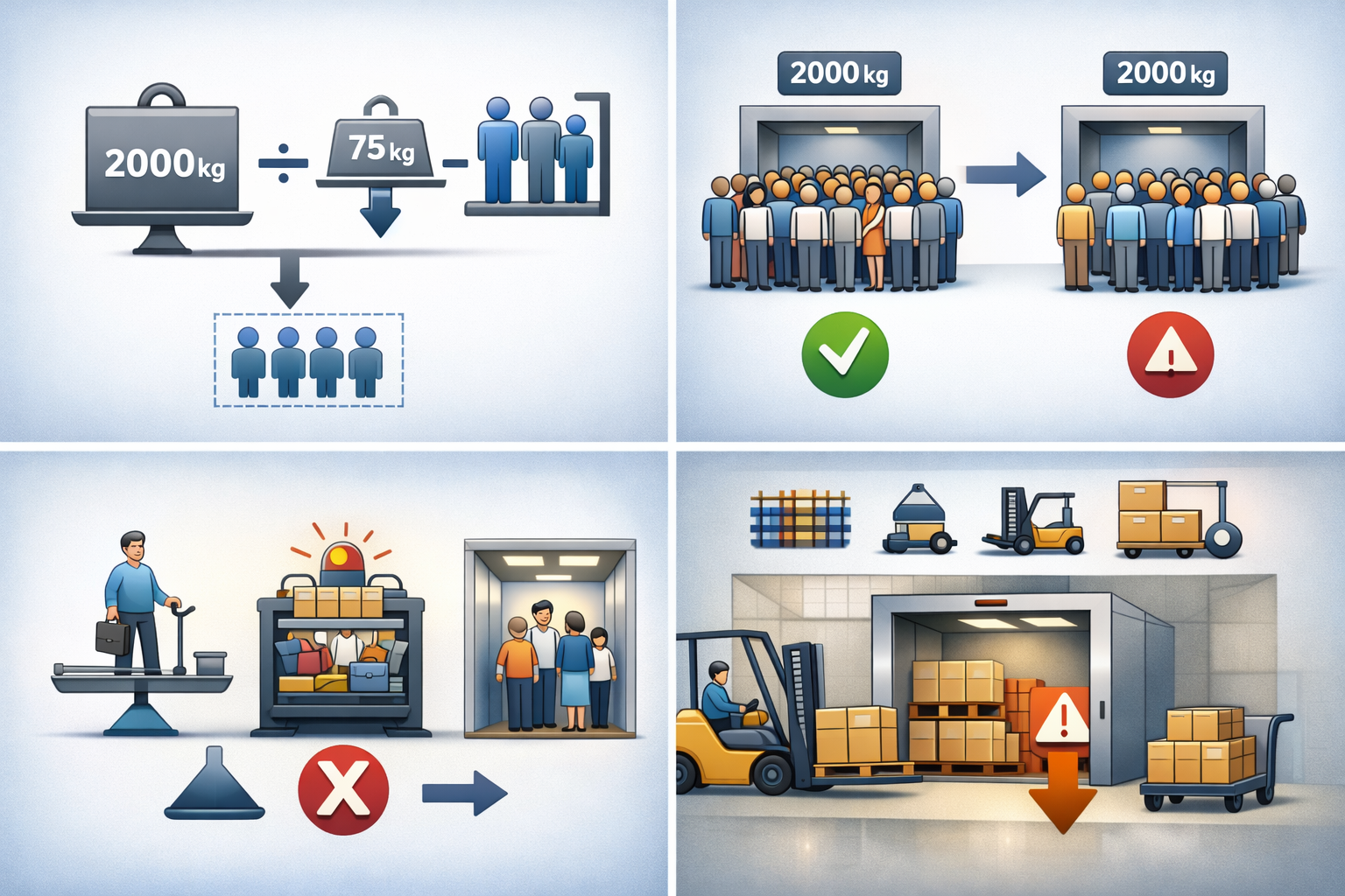 화물 엘리베이터 정원(인승)은 어떻게 정해질까? 2000kg/30명 표기의 원리와 1인 기준체중(65kg→75kg)