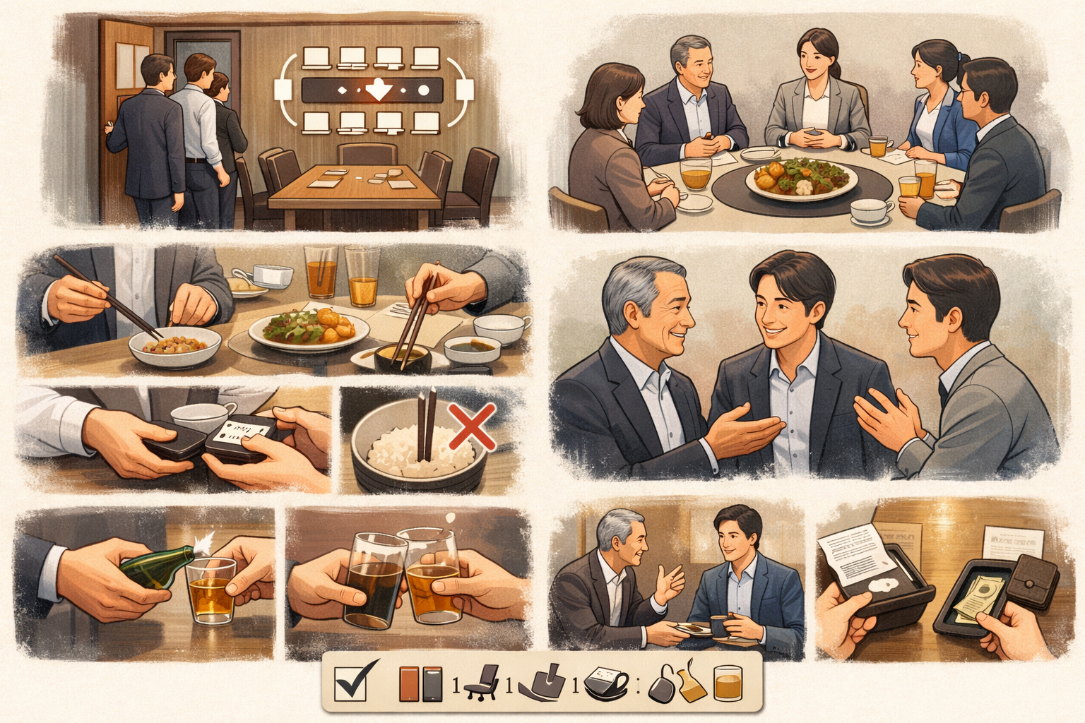 - 먼저 앉지 말고 잠깐 멈춘 뒤, 상석을 파악하고 호스트/윗사람 안내를 기다린다.