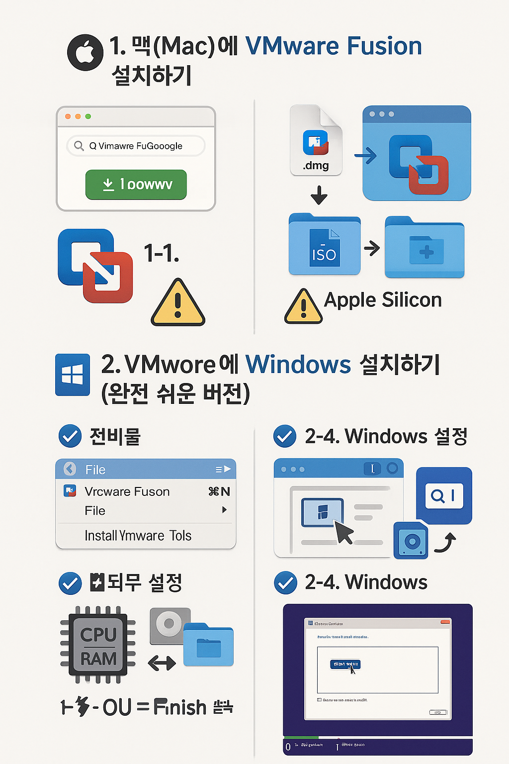 이 글은 Mac에 VMware Fusion을 설치한 뒤 Windows를 구동하는 전 과정을 초보자도 그대로 따라 할 수 있도록 단계별로 정리한 안내입니다. 최신 macOS 기준이며, Apple Silicon(M1·M2·M3·M4) 및 Intel 맥 모두 설치 가능합니다.