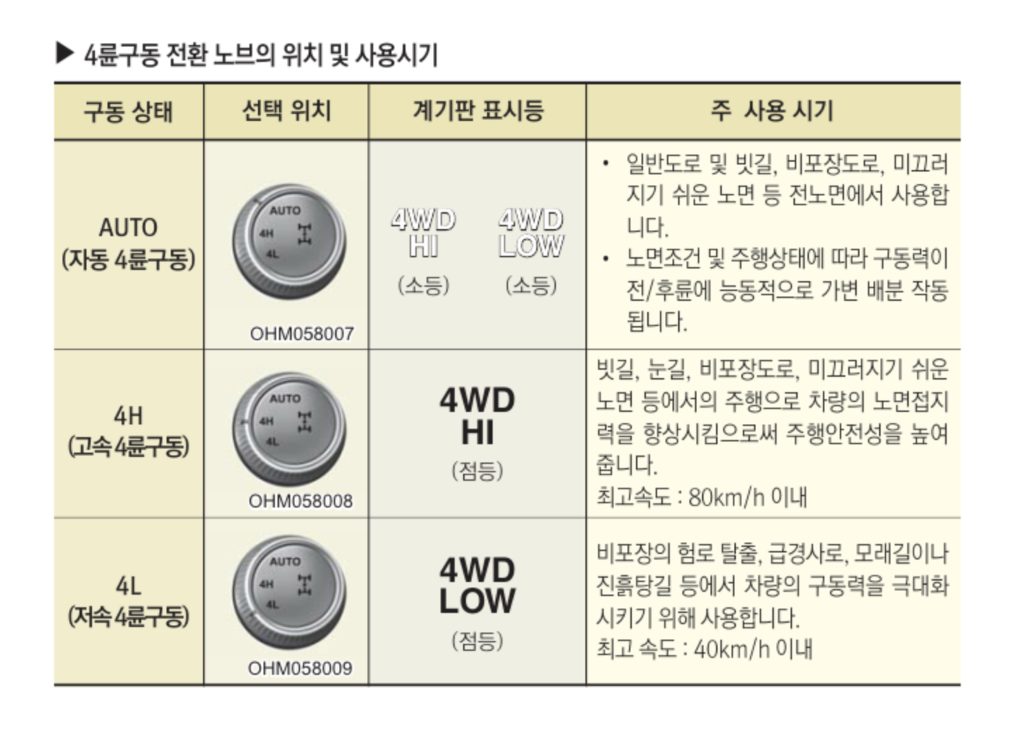 - 평소에는 AUTO 4WD로도 충분하지만, 빙판·급경사·극저온 상황에는 4L·4H가 확실한 차이를 만들어준다.