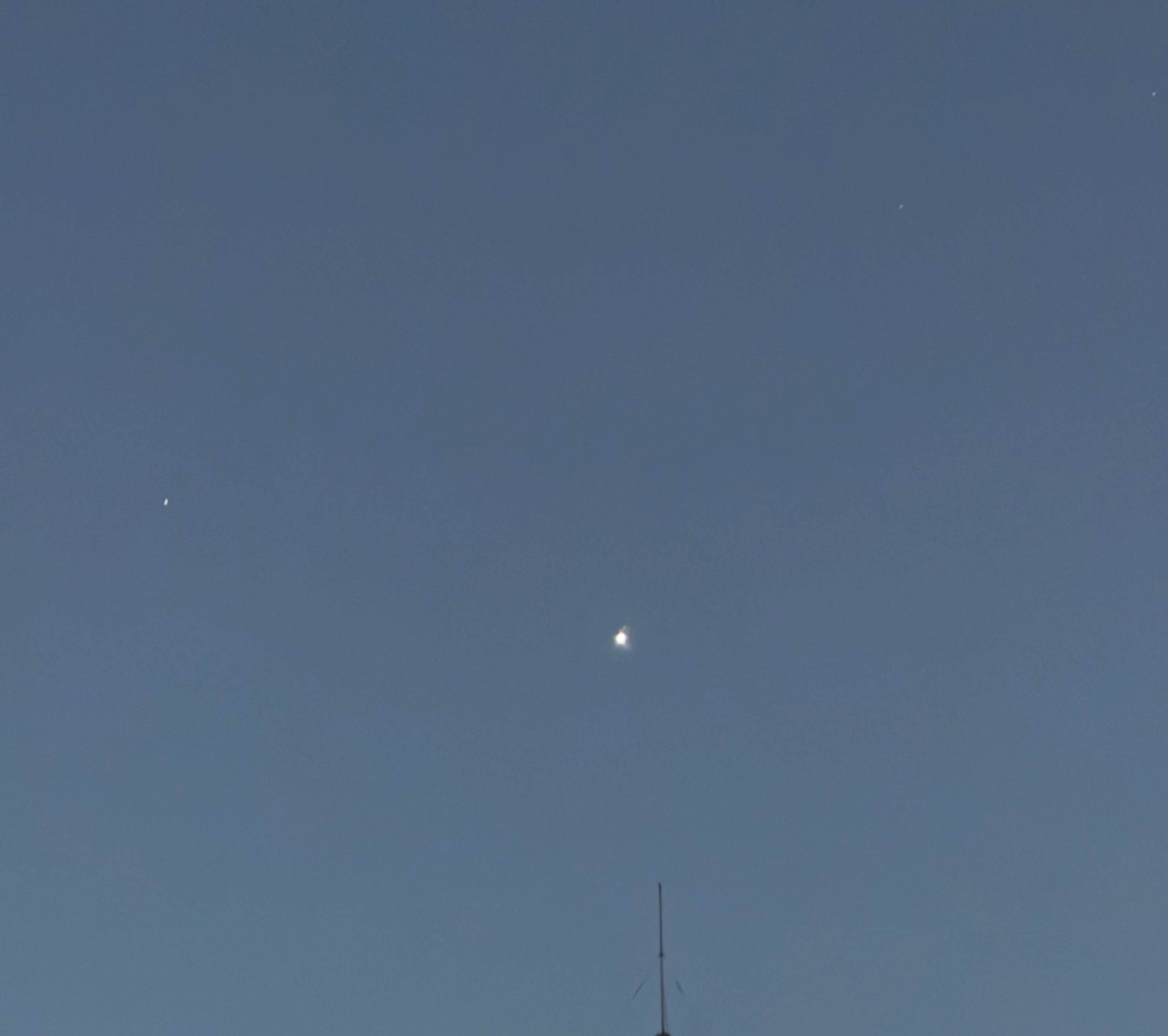 먼저 찍었던 사진에서는 아파트 옥상 위로 푸른 저녁 하늘이 펼쳐져 있고, 그 위에 하나의 강한 불빛이 떠 있습니다. 주변에도 작은 별들이 있지만, 이 불빛은 압도적으로 밝고 큽니다. 두 번째 사진에서는 하늘이 조금 더 어두워지고, 별이 여러 개 보이는 상황인데요. 제가 표시한 동그라미 안의 점 역시 다른 별들보다 훨씬 밝게 보이는 것이 특징입니다. 두 사진 모두에서 공통적으로 보이는 특징은 다음과 같습니다.