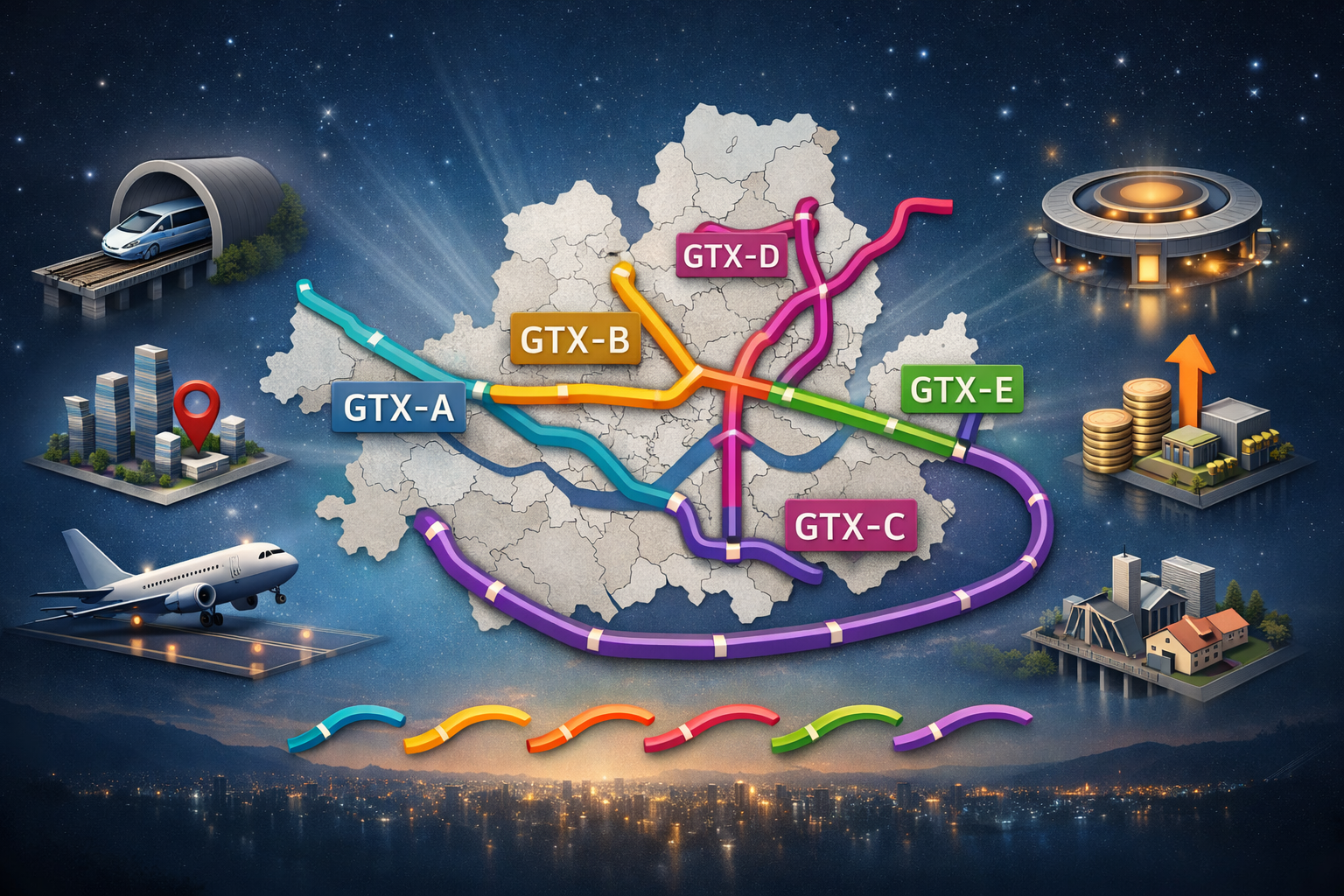 GTX는 수도권을 장거리로 빠르게 관통하는 광역급행철도 개념으로, 기존 지하철보다 정차역이 적고, 주요 거점 간 이동 시간을 “30분대 생활권”으로 단축하는 것을 목표로 합니다.